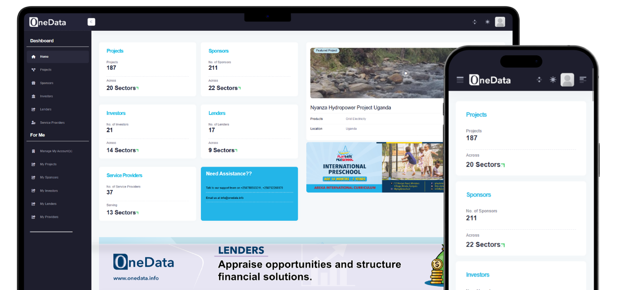 Investors and lenders can use One Data to find and appraise projects and project Sponsors, assess financial and operational risks, and gain access to well-documented, transparent opportunities. The platform enhances decision-making by providing real-time project performance information.